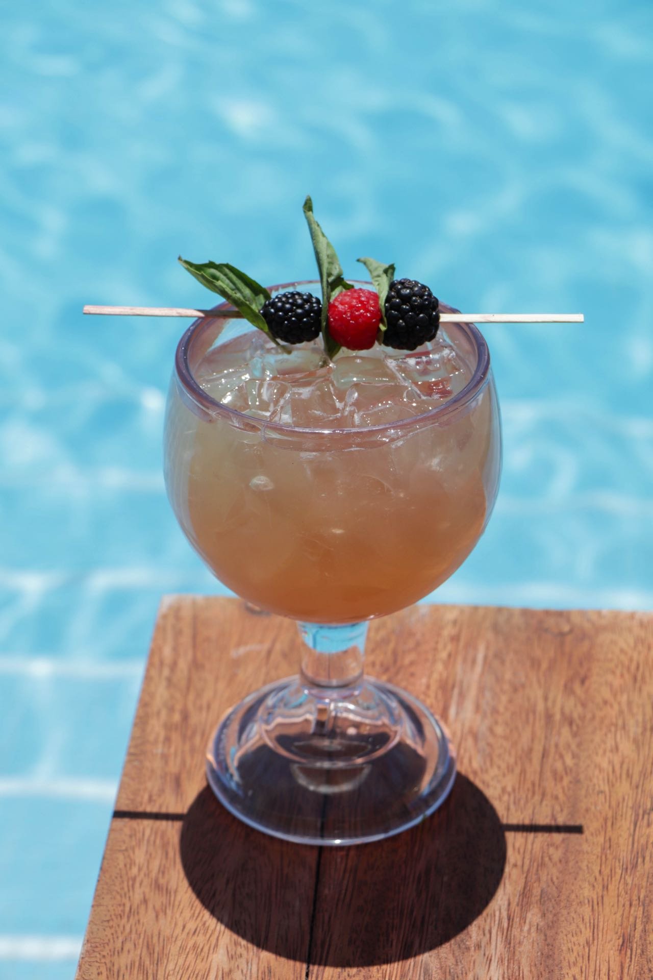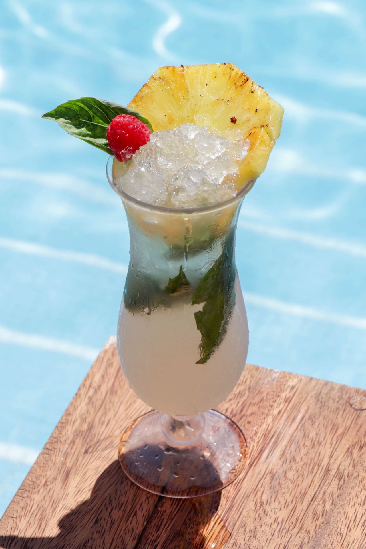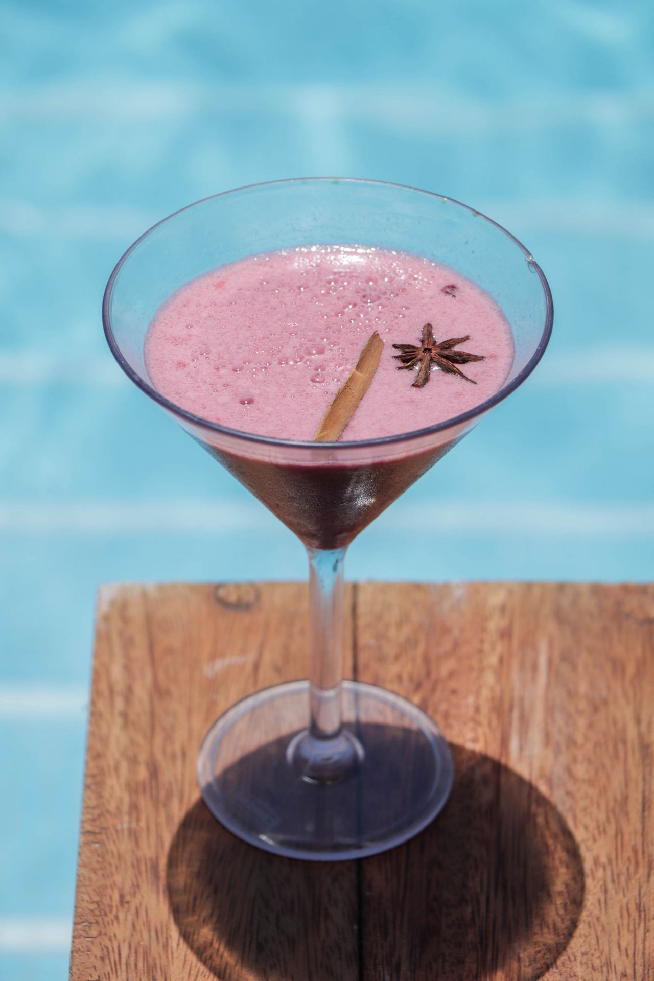 Raicilla, jugo de piña, jugo de arándano, hojas de hierbabuena copa ahogada en humo.