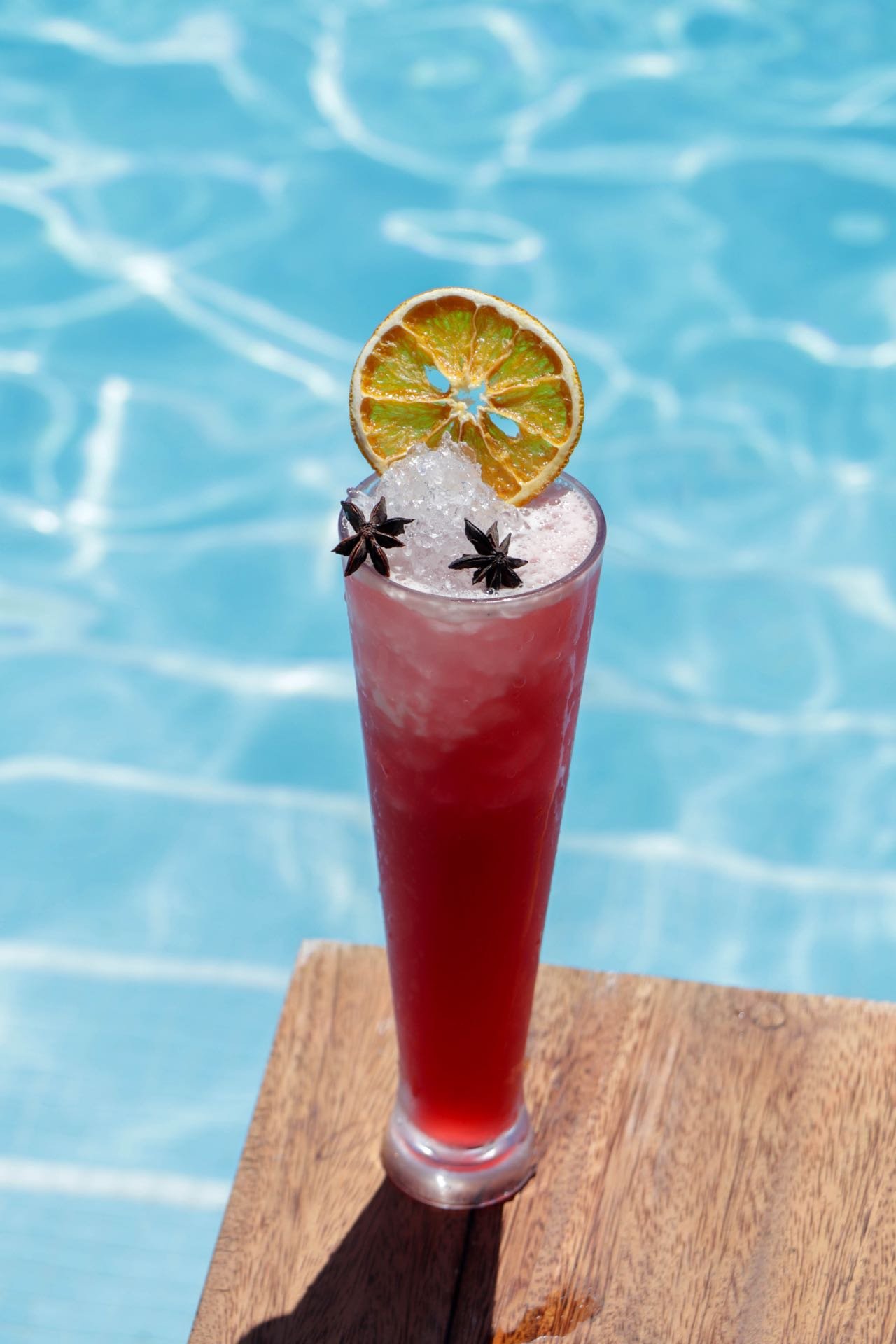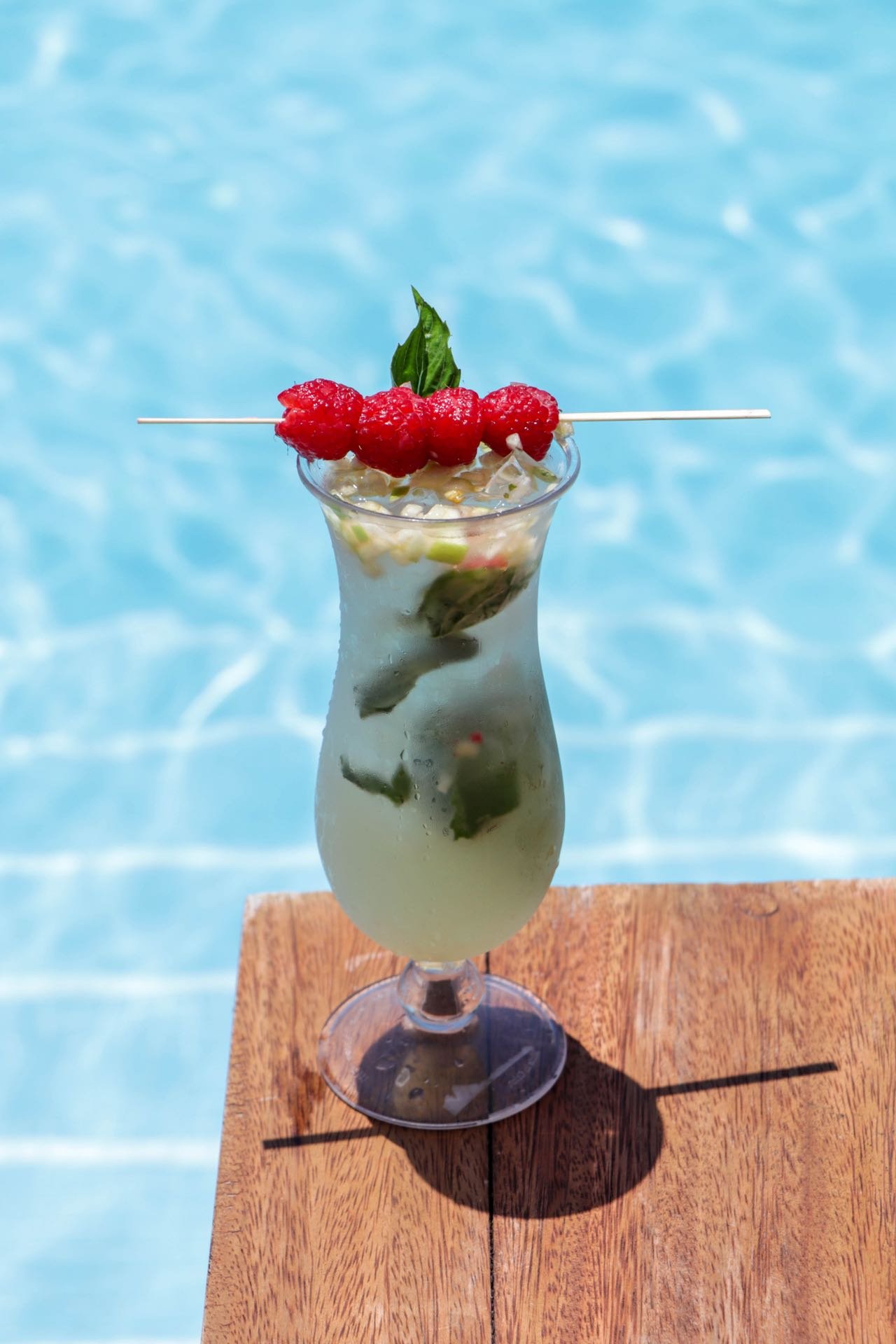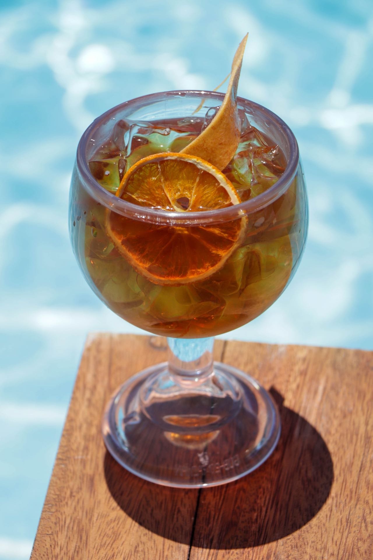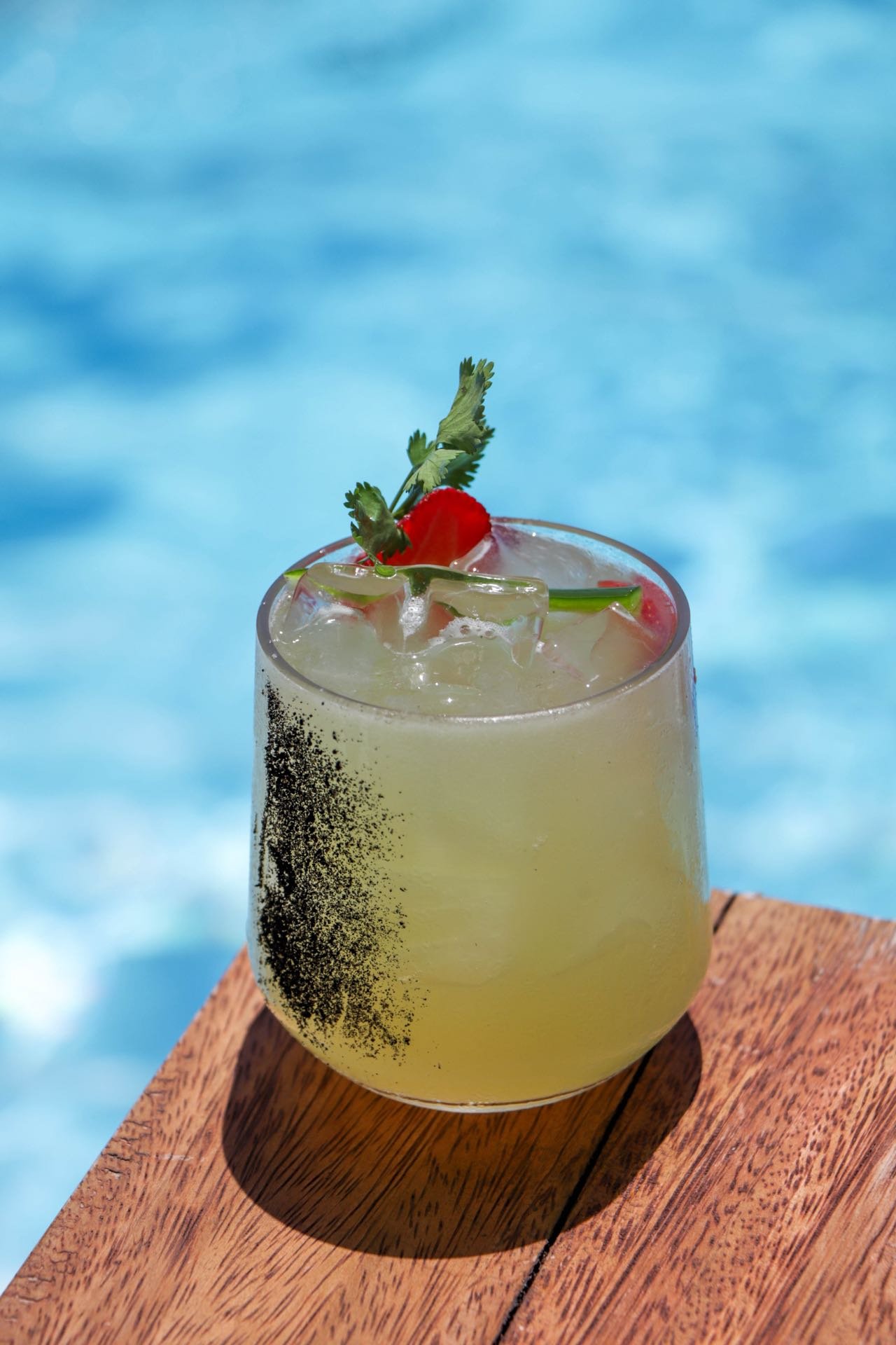 Raicilla, jugo de piña, jugo de arándano, hojas de hierbabuena copa ahogada en humo.